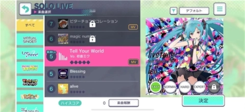 4、游戏包含单点(TAP)、滑键(FLICK)、长按(HOLD)三种不同类型的音符。值得注意的是,游戏里的部分歌曲提供「原曲ver.」(虚拟歌手版本)和「世界ver.」(虚拟歌手与游戏原创角色合唱版本)两种选择,同时歌曲难度从基础的Easy到最高阶的Master共划分五个等级,方便玩家根据自身水平挑选合适的难度进行游玩。