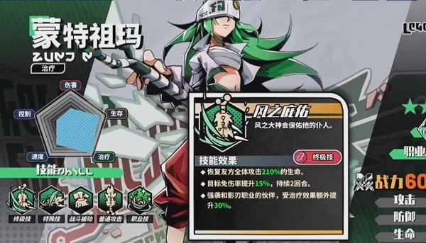 技能上,大招“风之庇护”是群体回复技能,能为友方全体单位恢复相当于其攻击力约210%的生命值,同时所有目标获得15%的免伤效果,持续两个回合。更厉害的是,这个技能对强袭和影刃职业的队友有额外加成——治疗效果会再提升30%。既有主动回复又附带免伤,碰到刺客或法师这类高输出对手时,治疗效果还能进一步增强,绝对是输出队伍里的关键技能,称得上是相当出色的治疗大招。