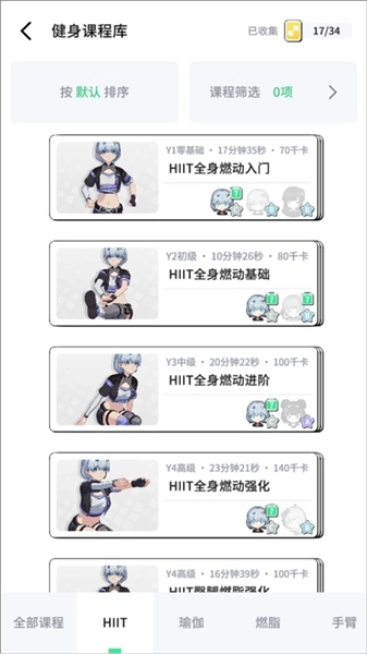 4、点击“健身”板块,这里的健身课程同样丰富多样,涵盖全身燃动、瑜伽、燃脂、手臂训练、增肌、塑形、拉伸放松、疾速燃脂以及拳击等多种类型;每个课程还标注了难度等级,从适合零基础的y1到挑战突破的y5不等。