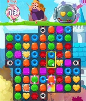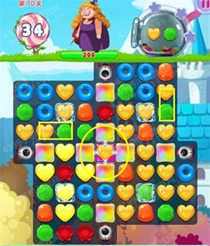 关卡目标:消除黄色和绿色的糖果,以此击败生命值为200的胖女巫