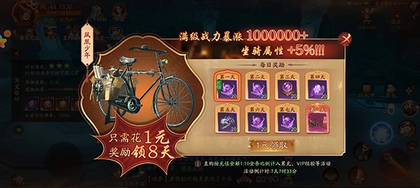 二八大杠仅需1元,就能连续8天领取奖励,第八天可获得粉色品质的“凤凰少年”!复古的造型搭配经典双轮,绝对是每位追风少年都不容错过的座驾。