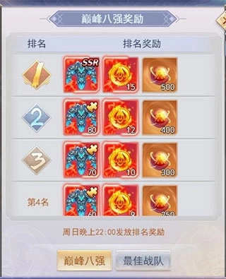 巅峰大奖包含巅峰八强和最佳战队奖励两部分。其中,巅峰八强的评定标准是每周累积通关层数位列前八的玩家;最佳战队奖励则授予在战队模式下闯关排名前五的战队。该奖项的结算时间为每周日晚上22点。当出现通关层数相同的情况时,将依据达到该层数时的战力来决定排名,战力越高者排名越靠前;若战力也相同,则用时较短的一方排名更靠前。