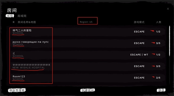 创建的房间包含医院、学校、下水道这三个地图,以及逃离和生存两种模式;根据参与的朋友数量选择对应人数的房间,且需等人满后才能开始游戏。