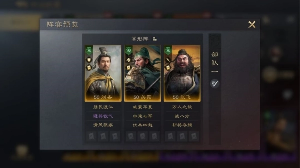 三人同队可激活桃园结义的缘分效果,在第三回合行动开始前,会自动驱散自身身上随机一种负面状态。刘备凭借自带战法,再搭配上【青囊急救】战法,能有效保障部队的续航能力,同时降低队伍受到负面效果的干扰;再借助张飞先手施加的“畏惧”状态,来提升关羽主动战法的发动概率,让关羽的输出变得更加稳定。