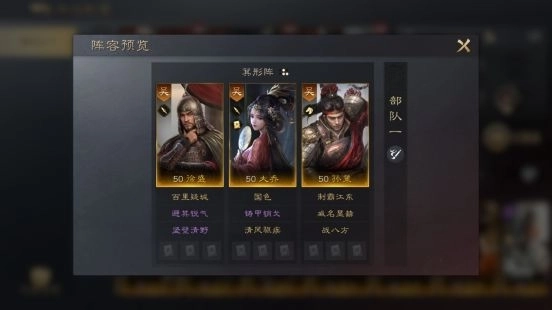 徐盛担任前排武将时,能为我方后排武将筑牢坚实的防御屏障,以此稳固部队的整体输出能力。大乔的自带战法【国色】可提升敌军承受的伤害量,助力太史慈打出更可观的伤害数值。太史慈的自带战法【弦无虚发】,能让他每回合稳定进行多次普通攻击,进而频繁触发追击战法,实现以最快速度击溃敌军武将的效果。