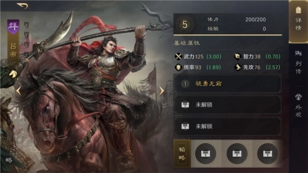 吕布是游戏里武力值顶尖的武将代表,他武力成长值格外突出,这让吕布在任何场合都能凭借高输出压制全场,还能更适配特定输出战法,进而打出惊人伤害。