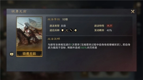 自带战法为【骁勇无前】,这是一个主动战法。该战法会使自身与敌方进行相互普攻(此过程可触发追击战法,且无视缴械效果);若自身武力值高于目标敌方,则可对其造成额外伤害。