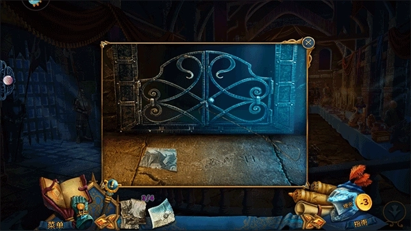 将插块嵌入凹槽,打开箱子后可获取粉笔与纸张;箱子盖子上有花瓶摆放的线索,需用粉笔和纸将其拓印下来。