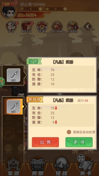 6、获取到更高阶的装备会自动替换身上的低阶装备,并且低阶装备会被出售以换取经验和钱币;当获得低阶装备时,则能够直接出售来获取各类奖励。