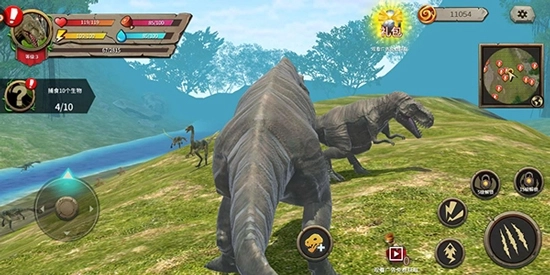 移动操控方式:借助屏幕左下方的轮盘,可操控你的恐龙进行移动,以此探索周边环境或是靠近敌人。