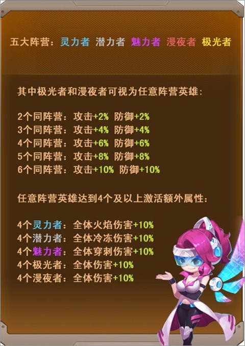 2. 留意阵营搭配:若同一阵营的英雄一同出战,将会为出战的小队带来属性加成。