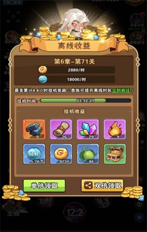 3、挂机、离线也可以领取经验、铸造石等养成道具收益。通过提升贵族等级、通过更多章节等离线获取收益的百分比越多。