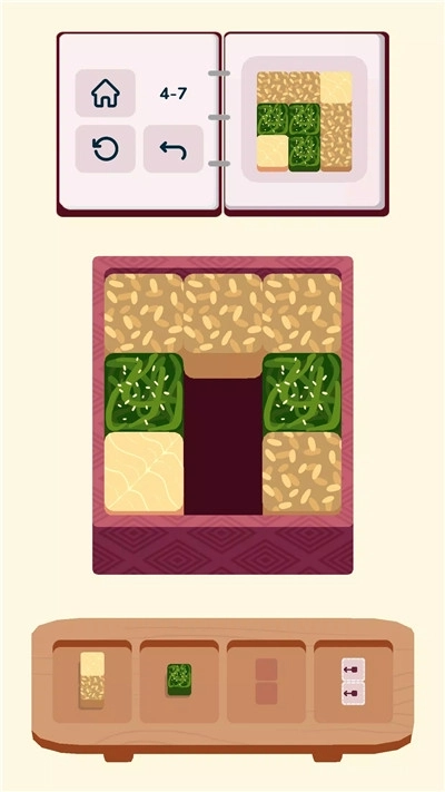 3、随着关卡的推进,饭盒的格子数量会逐渐增加,食材的复杂程度也会不断提升,到了后期,还会有需要分步骤解锁的隐藏食谱出现。