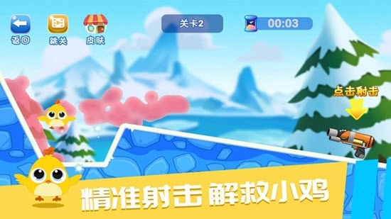这是一个以射击玩法为核心的解谜小游戏——《解冻小鸡》。在游戏中,你需要巧妙利用场景里的各种互动元素与障碍,帮助被困在冰块中的小鸡顺利逃生。由于射击次数十分有限,你得不断规划出最优策略才能完成关卡挑战。现在,直接点击“解冻小鸡”就能开启游戏之旅啦!