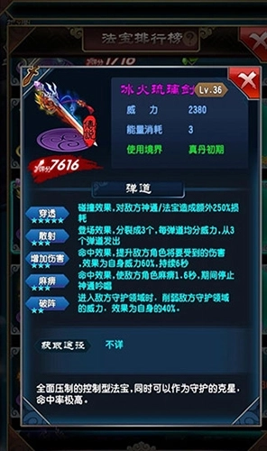 用途:在斗法场里,它不只能和对方的本命比拼硬度,搭配修复好的破阵还能击碎真丹修士的任何守护领域类法宝。而且叠加的增伤效果是秒杀对手的绝佳时机,再配合本命法宝或者瞬击技能,简直无往而不利。另外,它也是完成主线、支线任务和对付小怪的最强法宝——只要命中小怪,随便扔几件别的法宝就能轻松获胜,再也不用受卡关的折磨了。
