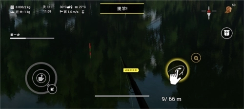 3、耐心等待就能让鱼儿上钩,浮标动时,可点击右下角的放大键放大浮标观察动向,手机振动意味着有鱼上钩,钩子收晚了鱼会跑掉。