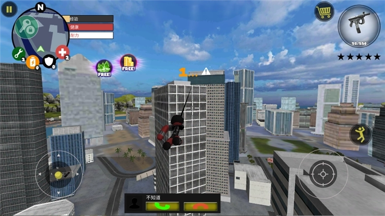 左侧控制移动与加速,右侧负责绳索操作和攻击(含跳跃功能),跳跃键独立设置;画面右上区域实时更新武器切换状态,血量与经验值的变化也清晰呈现、一目了然。玩家可自由选择玩法,与其他帮派成员展开激烈交火——击杀敌人能获取经验,连续击杀会累积星级,届时警察及周边角色将对你重点“关照”,发起猛烈攻势。而你的核心任务,便是在这样的危机中存活下来,并成功击败其他对手。