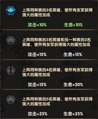 当战场上上阵的同种族英雄数量达到3名或以上时,即可为阵容带来至少10%的攻击与生命属性加成。