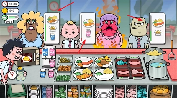 2、在界面下方挑选合适的食物,直接递送给对应的客人,操作一定要在客人的耐心耗尽之前完成。