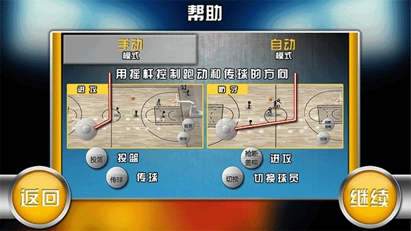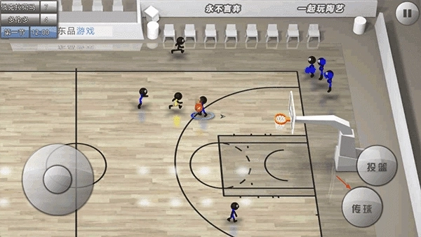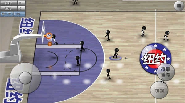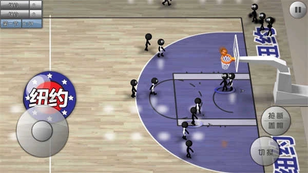 虚拟摇杆驱动全场跑位,两个核心功能键随攻防态势智能切换用途:进攻时实现传球、投篮、突破,防守时触发抢断、卡位、争抢篮板,简化操作却不牺牲策略维度。