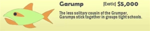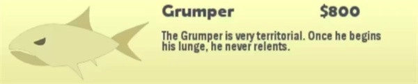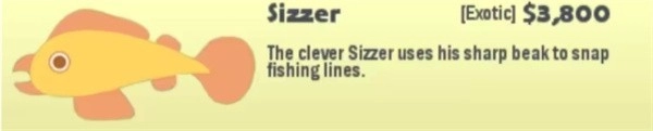 行为特征:在水域中来回穿梭游动,一旦察觉到同伴Sizzer或是幼崽Baby Sizzer上钩,它就会用嘴咬断你的钓鱼线。