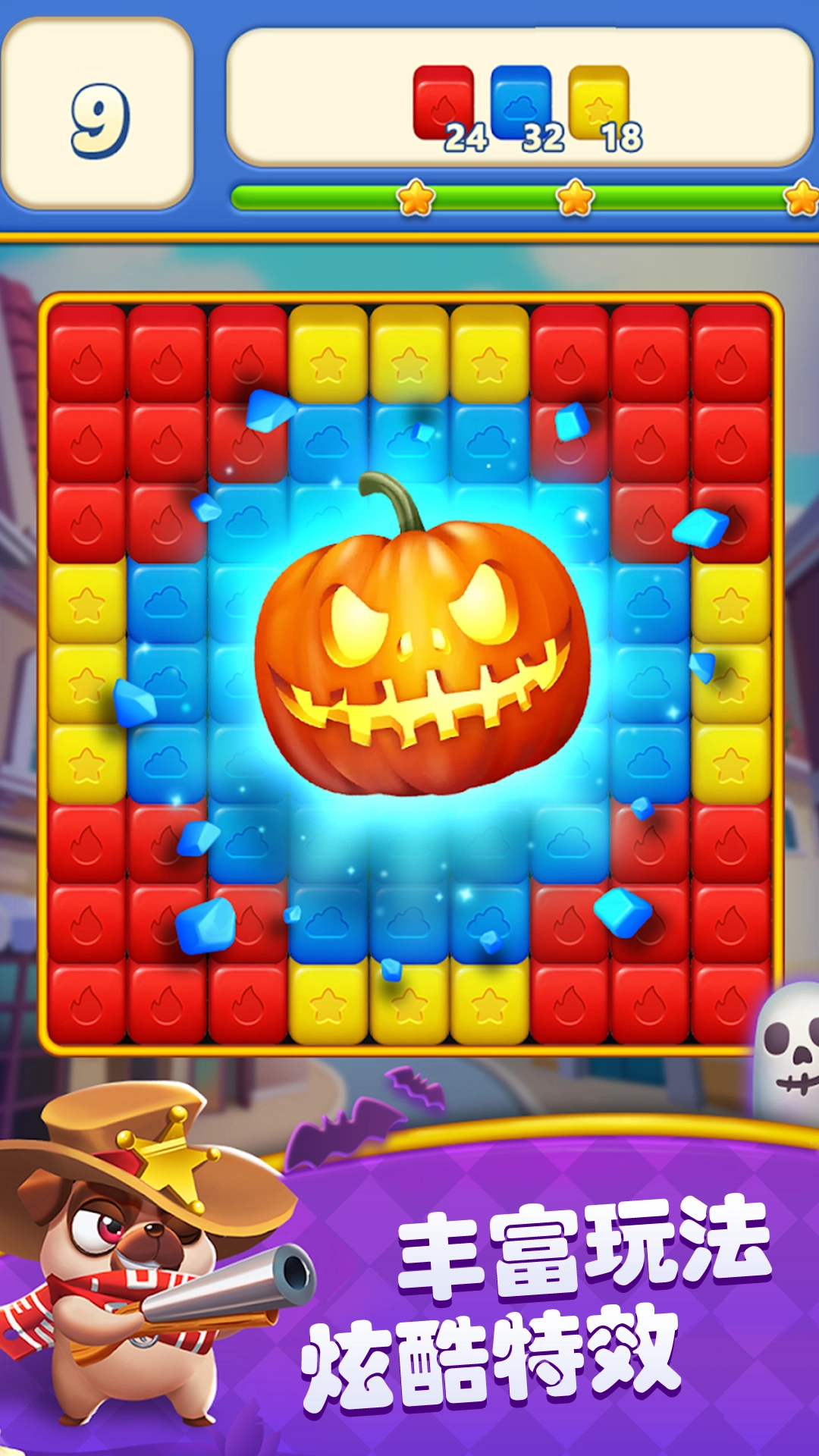 1.融入了各种好玩的方块消除元素,自由的去投入游戏去完成挑战;