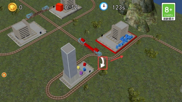 沿着轨道行驶,遇到分岔路口时,点击箭头改变转向,顺利前往下一个目的地。