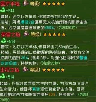 丹妮目前可以使用的武器共有七种,分别是单体治疗的【医疗手枪】、【液压手枪】、【荣誉之枪】、【王权之枪】以及群体治疗的【小丑手枪】、【脉冲手枪】、【热能手枪】。单体治疗武器的治疗量更高;而群疗武器虽然单次治疗量较低,但可以为多个单位提供治疗,各有优势。猎人们在选择武器时,可优先考虑品级较高且保命能力强的装备,如【医疗手枪】、【荣誉之枪】、【王权之枪】等。