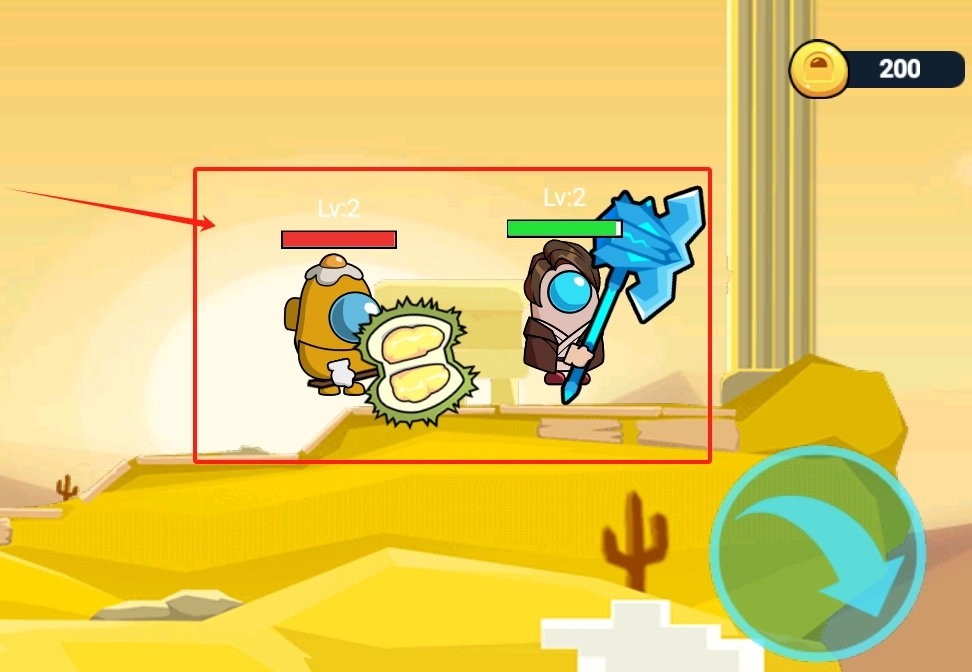 3、游戏场景中,Lv:2等级的两个角色正在对峙,左侧角色被榴莲砸中。