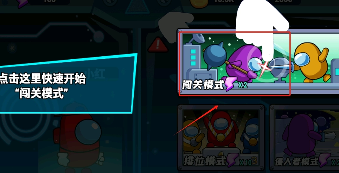 1、游戏界面蓝色框中点击这里快速开始按钮,即可进入闯关模式。