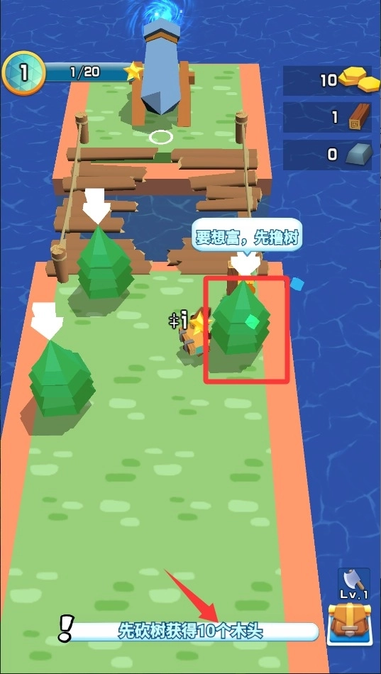 2、靠近树木后连续点击砍伐按钮,积累足够数量的木材用于后续建造桥梁和其他设施。