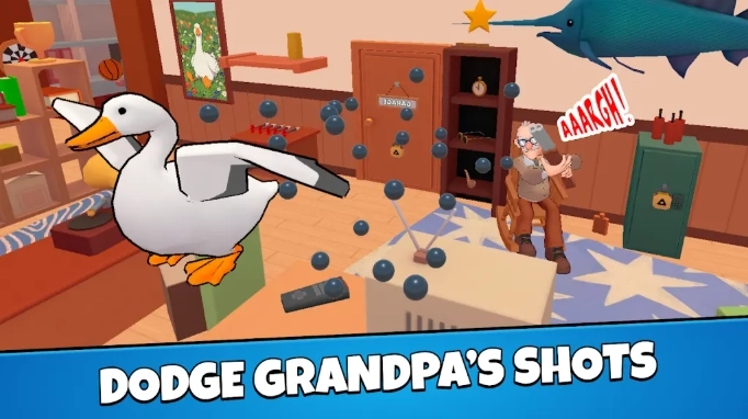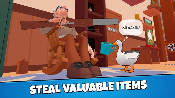 1、操控大鹅在房间内自由探索,寻找各种有可能制造恶作剧的地方,帮助你作弄房间内的老奶奶和老爷爷。