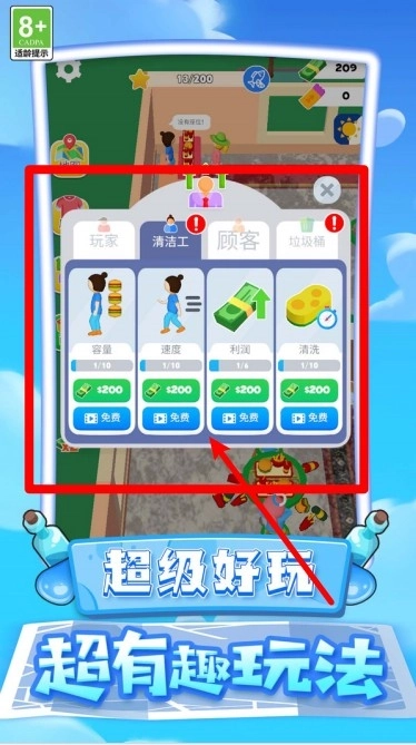 2.角色升级系统:玩家可进入角色面板,对玩家、清洁工、顾客与垃圾桶进行升级,提升速度、收益与清洁效率,让整个餐厅运作更流畅。