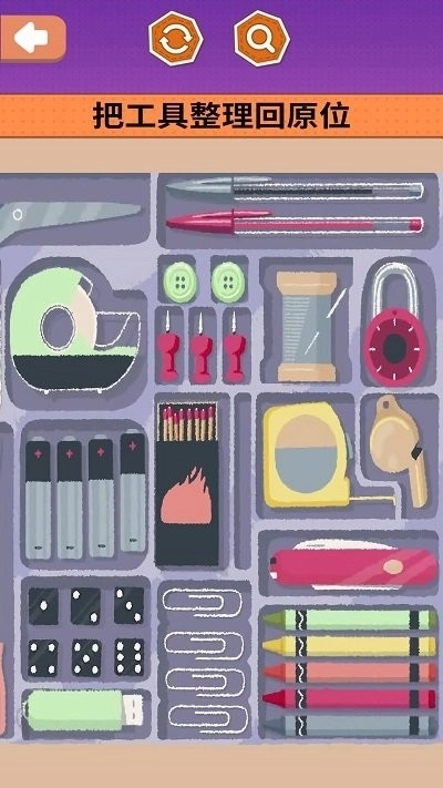 1、进入关卡后首先观察场景,分析各类物品的属性和正确摆放位置,制定收纳策略。