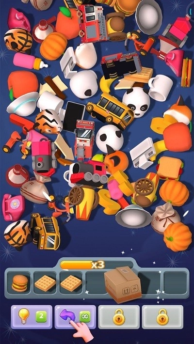 2、创新的消除机制打破了传统三消的规则限制,允许相邻物品自由进行合并操作,只要收集到3个同类物品就能完成消除。这种玩法操作简便,但背后蕴含着丰富的策略性,系统会引导玩家主动思考物品的摆放顺序。