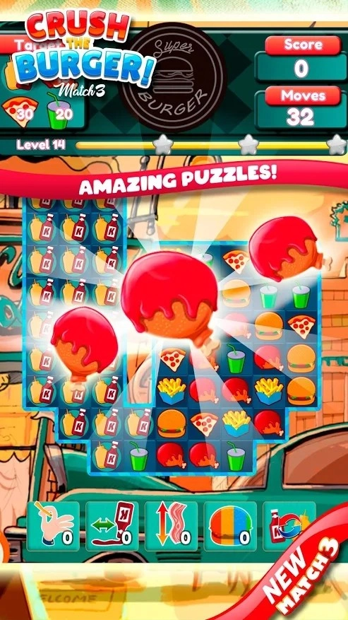 比如,把3个及以上的汉堡排放在一起。消除的数量越多,得到的物品就越厉害。