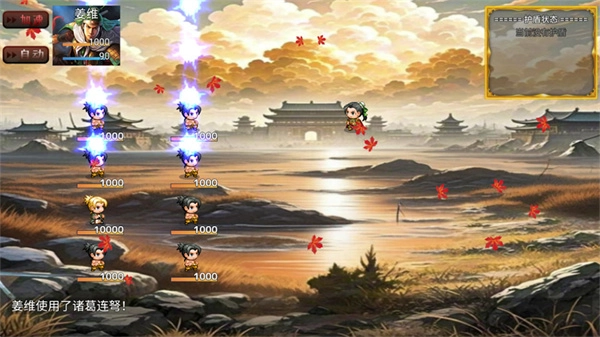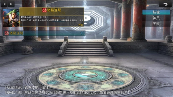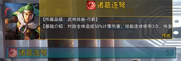 诸葛连弩:对敌方全体造成50%的计策伤害,能连续发动三次攻击,且会依据造成的伤害量来回复自身的兵力。